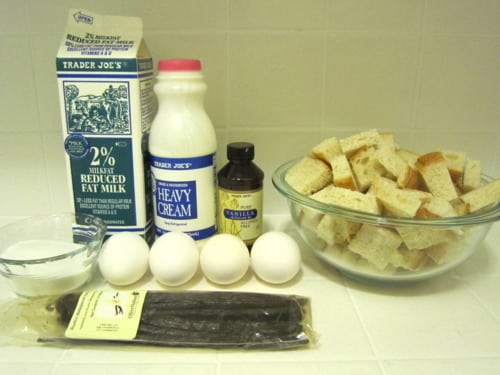 In a large glass measuring cup or another bowl, whisk together the eggs, milk, heavy cream, sugar, vanilla and seeds from the vanilla bean.