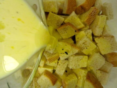 Pour the mixture evenly over the bread cubes.