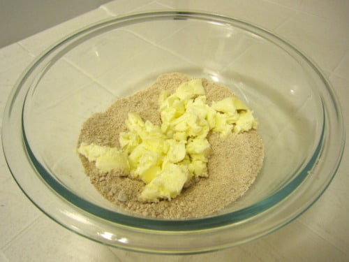 Add the cold butter and toss to coat, using your fingers to work the butter into the dry ingredients until it resembles coarse crumbs.