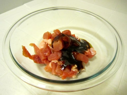 In a small bowl, combine the pork, fish sauce, oyster sauce and sesame oil. Cover and chill in the refrigerator for at least 30 minutes.