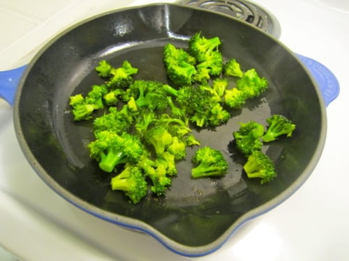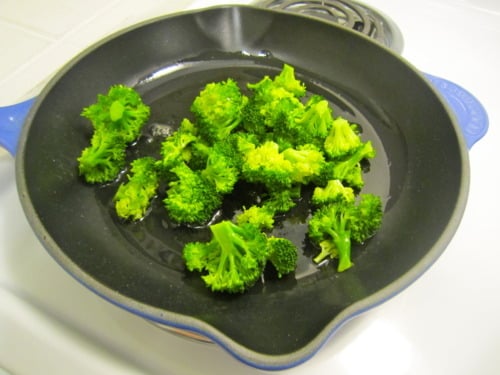 Bring 1-inch of water to a boil in a saucepan with a steamer. (If you don’t have a steamer, you can simply put the broccoli directly into an inch of boiling water.) Add the broccoli to the steamer and cover; let steam until bright green, about 2 minutes.