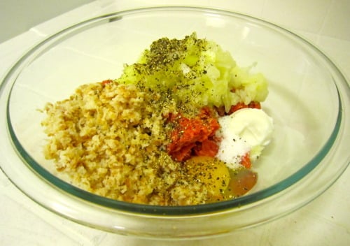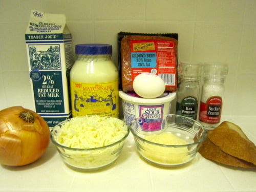 In a large bowl, add the breadcrumb mixture, ground beef, grated onion, sour cream, egg, salt and pepper.