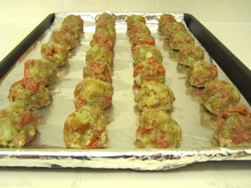 Roll the mixture into 1 1/4-to-1 1/2-inch meatballs and place on onto prepared baking sheet. (I used a small cookie scoop for this.)