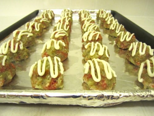Drizzle a small amount of mayonnaise on each meatball. (A squeeze bottle or Ziploc bag is perfect for this.)