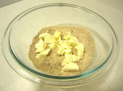Add the cold butter and toss to coat, using your fingers to work the butter into the dry ingredients until it resembles coarse crumbs; set aside.