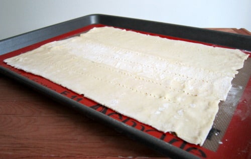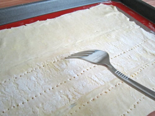 With very delicate hands, place the puff pastry onto the prepared baking sheet. Using a fork, pierce the dough in horizontal lines at 1-inch intervals.
