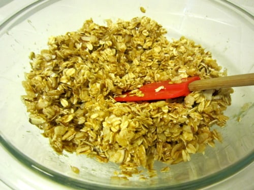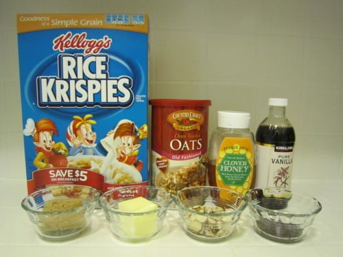 But of course Brown Eyed Baker came to my rescue with her “no-bake” granola bars. They were very quick and easy to put together but the best part about them was how simple they were. It’s simply a mixture of some oats, crispy rice cereal and sliced almonds held together by a caramel-y sauce. Yeah, you heard me. These are healthy granola bars that taste like CARAMEL. It’s not even overpoweringly sweet – just sweet enough to give you a nice kick in every bite. Mmmmm…
