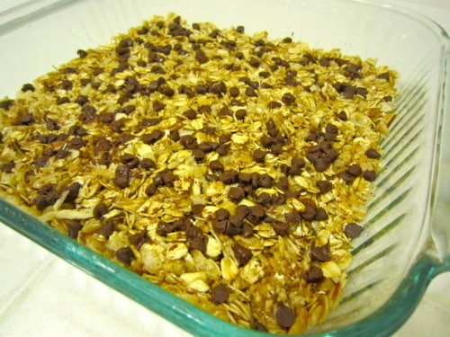 Let cool at room temperature for at least 2 hours, or until the chocolate chips are set, before cutting into bars.