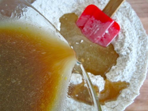 Pour mixture over dry ingredients and stir using a rubber spatula just until moist.
