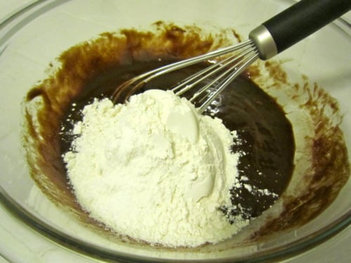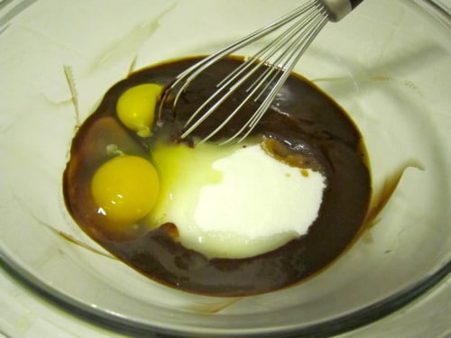 Add the sugar, eggs and vanilla, whisking until well combined.