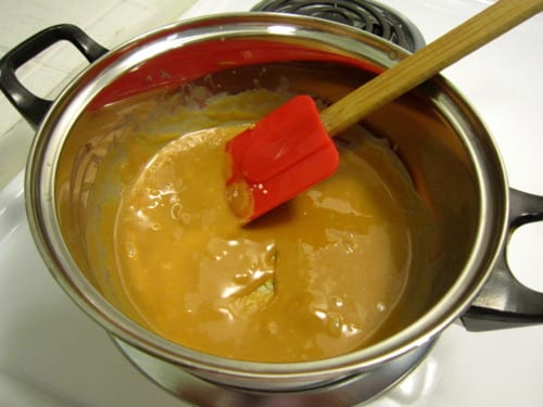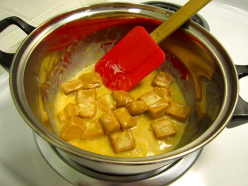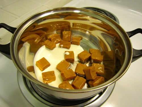 To make the caramel filling, combine the caramel candies and cream in a medium saucepan over medium low heat.