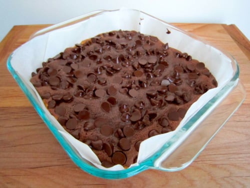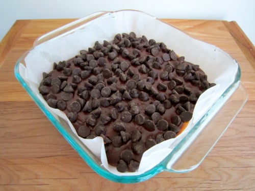 Spread the remaining brownie batter in an even layer over the caramel. Sprinkle with chocolate chips.