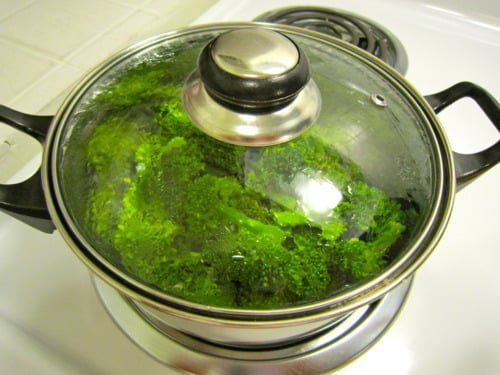Bring 1-inch of water to a boil in a saucepan with a steamer. (If you don’t have a steamer, you can simply put the broccoli directly into an inch of boiling water.) Add the broccoli to the steamer and cover; let steam until bright green, about 2 minutes.