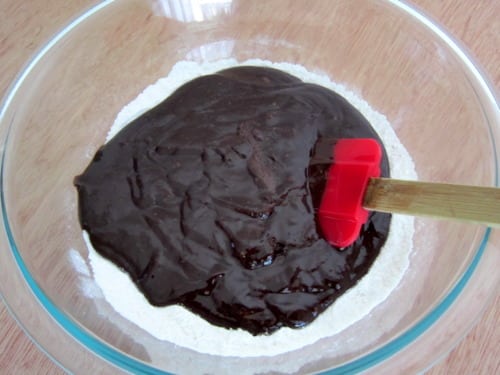 Pour mixture over dry ingredients and stir using a rubber spatula just until moist.