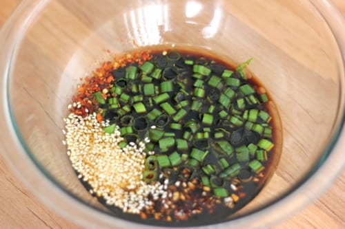 In a medium bowl, whisk together the soy sauce, sugar, sesame oil, garlic, green onions, sesame seeds and red pepper.