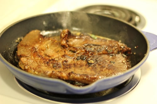 Now let’s cook the steak. You can definitely grill it, which I’m sure would be better taste-wise, but I just threw it in a cast iron skillet for about 3-4 minutes per side for medium rare.