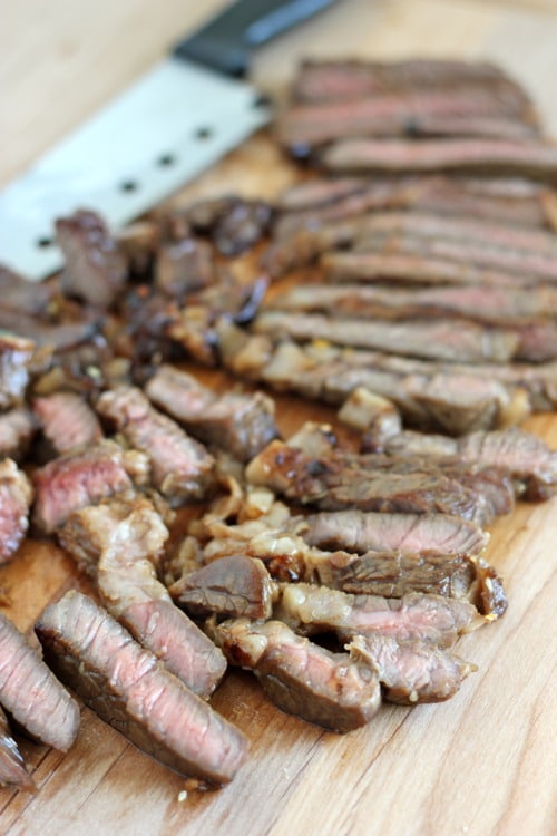 Heat olive oil in a large skillet over medium high heat. Add the steak and cook, flipping once, until medium rare, about 3-4 minutes per side. Let the meat rest for 5-7 minutes before carving into thin slices.