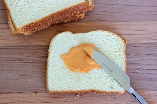 You can also add some sandwich spread on the other side of the bread. I used some leftover Sriracha cream sauce.