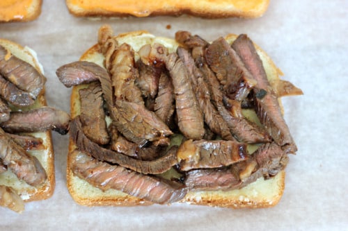 Once the steak is cool enough to handle, slice them up real nice for your sandwiches. Be sure to sample a couple but definitely not half of it like I did.