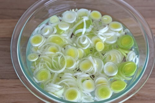 Let’s first start by slicing up some leeks and giving them a good rinse in a bowl of water. Once they’re nice and clean, go ahead and dry them with a clean dish towel.