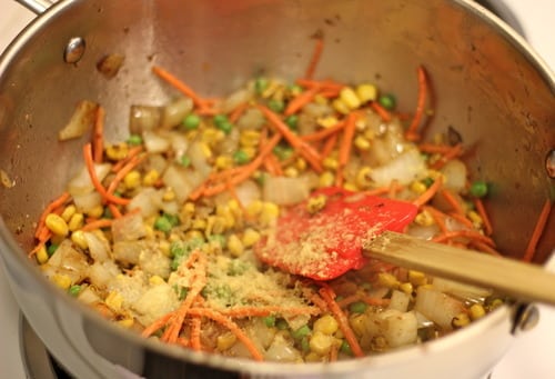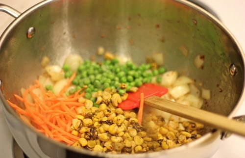and then some veggies. I used corn, peas and carrots but feel free to throw in whatever you got.