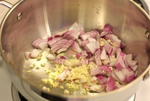While that’s happening, let’s sauté some garlic and red onions.