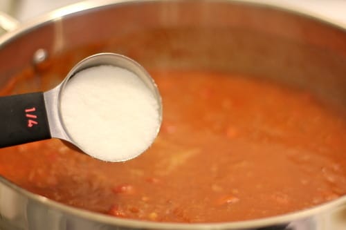 Season with sugar, salt and pepper, to taste. Simmer for an additional 5 minutes.