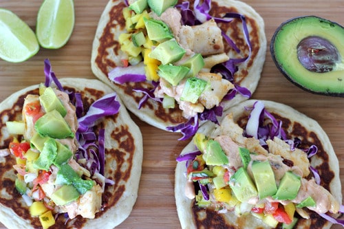 I don’t even know where to begin with these tacos. Seriously. It’s probably the best tacos I’ve had in my entire life. No joke. If I could, I’d eat this every. single. day. I mean, it’s a buttery biscuit base as the tortilla filled with super zesty lime tilapia blooming with chipotle pepper flavor topped with fresh mango salsa drizzled with chipotle sour cream and topped with fresh avocado (wow that was a mouthful). Are you not dying yet?! I mean I’m having some major fish taco cravings just looking at these photos!