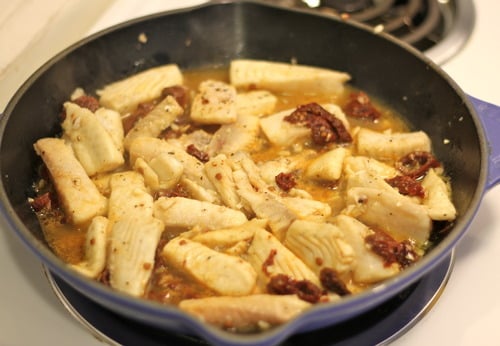Now let’s take the lime-garlic-fish mixture and throw it into a skillet with some more cut-up chipotle peppers.