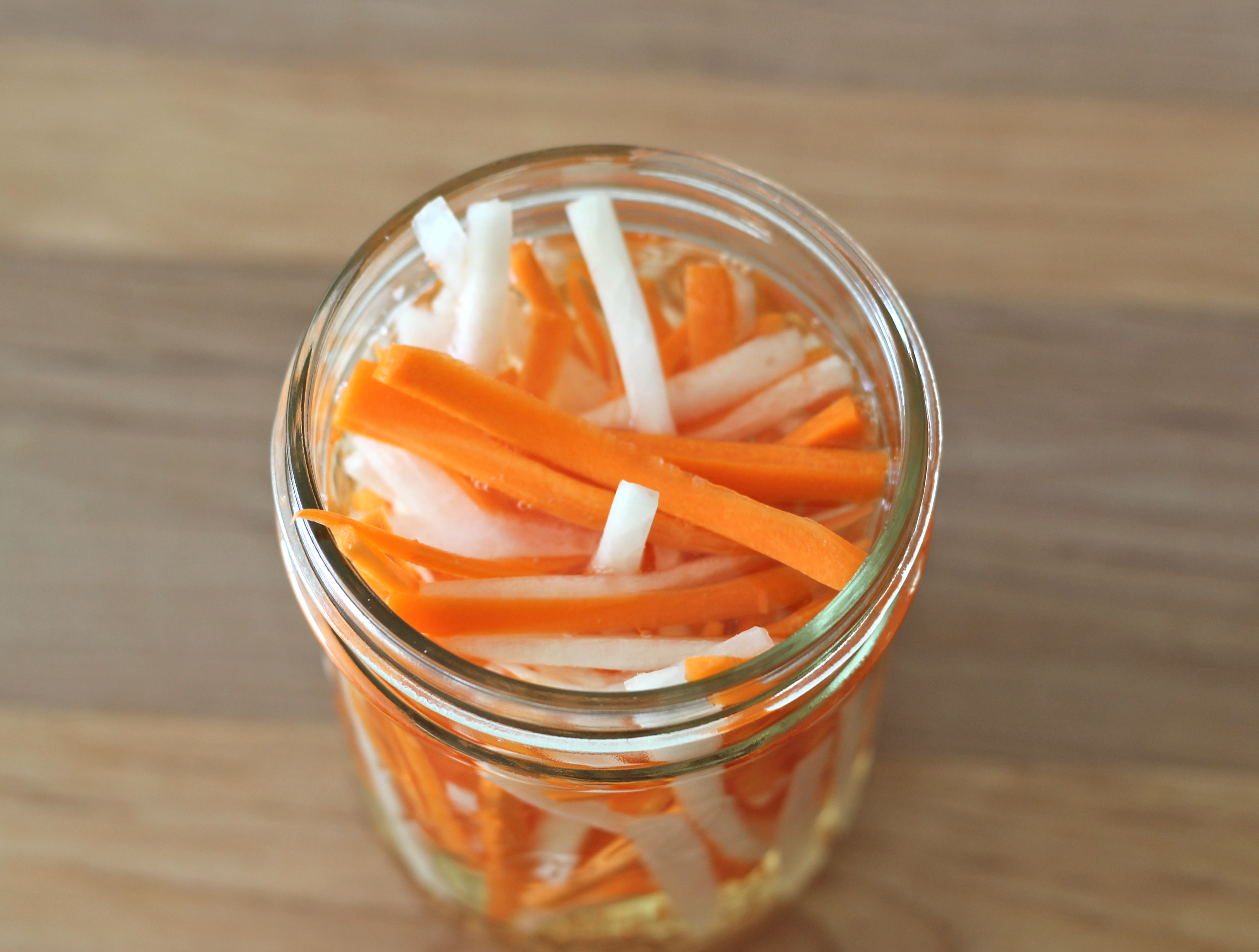 Let’s first pickle some julienned daikon radish and carrots. All you do is throw the veggies into a mason jar and pour in a simmered sugar-vinegar-water mixture. Let this sit in the fridge for at least an hour.