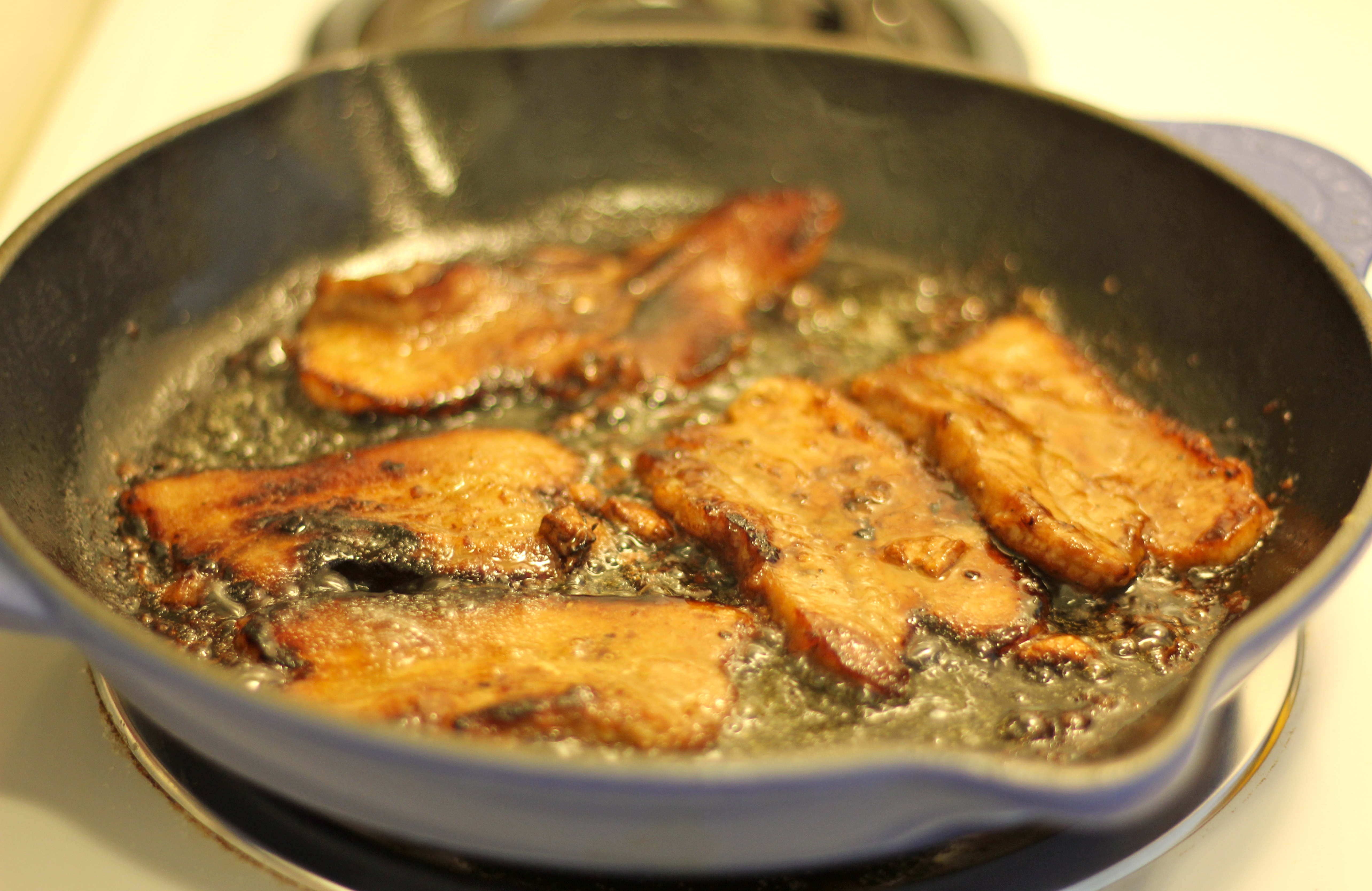 I bought the pork belly from Chinese grocery store, fresh. I found it very difficult to cut as the whole meat slides around with all the fat. I ended up cutting them about 3/4″ thick (I don’t think I can possibly slice them as thin as they show up in your pictures). After I pan fried them the taste is great, but they’re chewy/tough. Since it’s pork I had to make sure it’s fully cooked. How do you make them not tough?