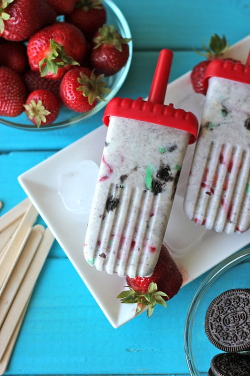 It’s a wonderful twist off the traditional cookies and cream popsicles as I substituted the mint creme Oreo cookies, and then I added some fresh strawberries to give it that refreshing kick.