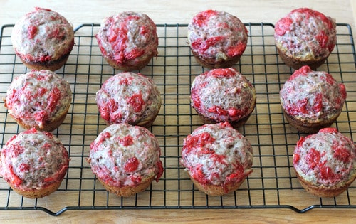 Scoop the batter evenly into the muffin tray. Top each muffin with 1 teaspoon strawberry balsamic jam, swirling into the batter using figure eight motions.
