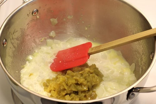 Heat olive oil in a medium pot over medium low heat. Add the onion and garlic and cook until the onions begin to soften, about 3-4 minutes. Stir in the chilies and milk until heated through, about 1 minute. Stir in the cheeses until smooth, about 1-2 minutes; season with salt and pepper, to taste. If the mixture is too thick, add more milk as needed.