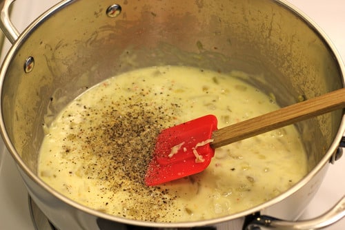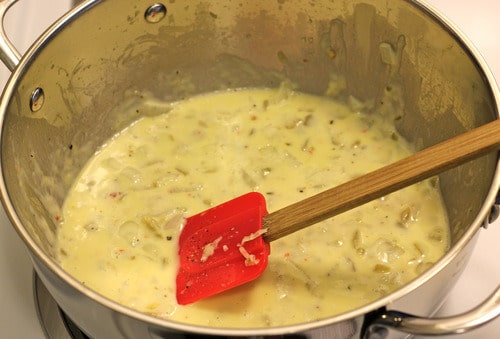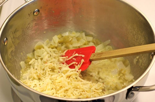 Next, we’ll throw in the cheeses, a handful at a time. Stir it all together until it gets nice and smooth which should take about 2 minutes. You can always add more milk if it’s too thick.