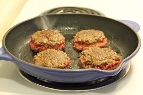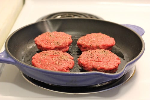 Heat olive oil in a large skillet over medium high heat. Add the patties to the skillet and cook until browned and cooked through to medium rare, about 3-4 minutes per side, flipping only once.