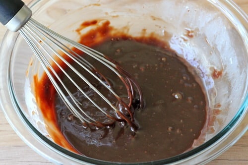 So for the glaze, all we need is some Nutella magic and some heavy cream. Give it a good whisk until it gets smooth and creamy.