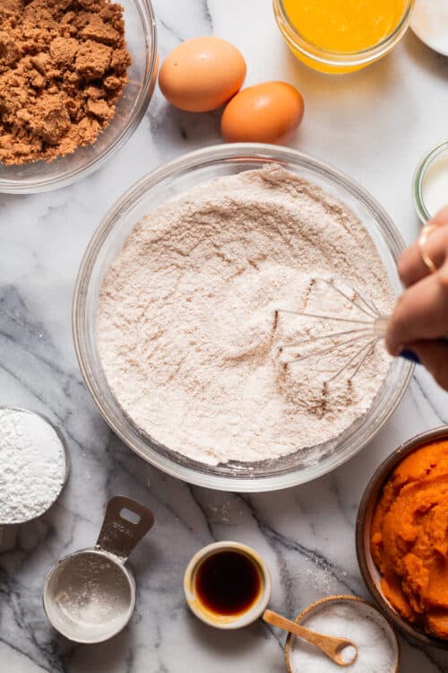 - In a large bowl, combine flour, sugar, cinnamon, ginger, nutmeg, baking powder, baking soda and salt.