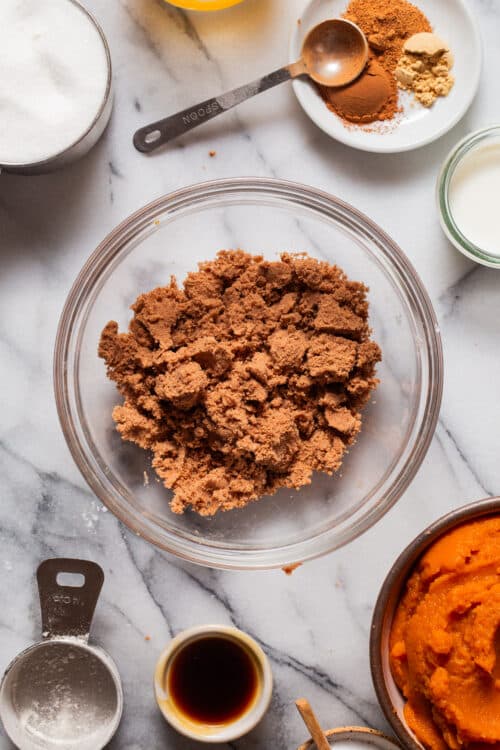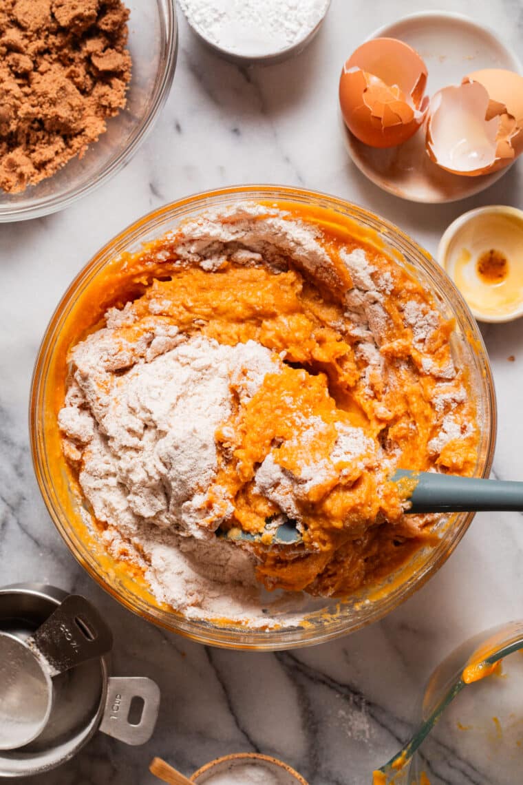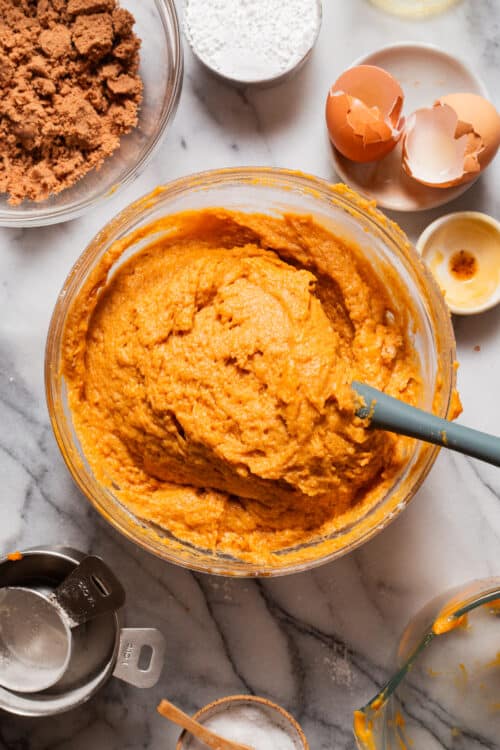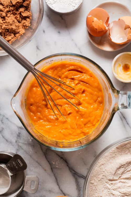 - In a large glass measuring cup or another bowl, whisk together pumpkin puree, butter, eggs and vanilla.