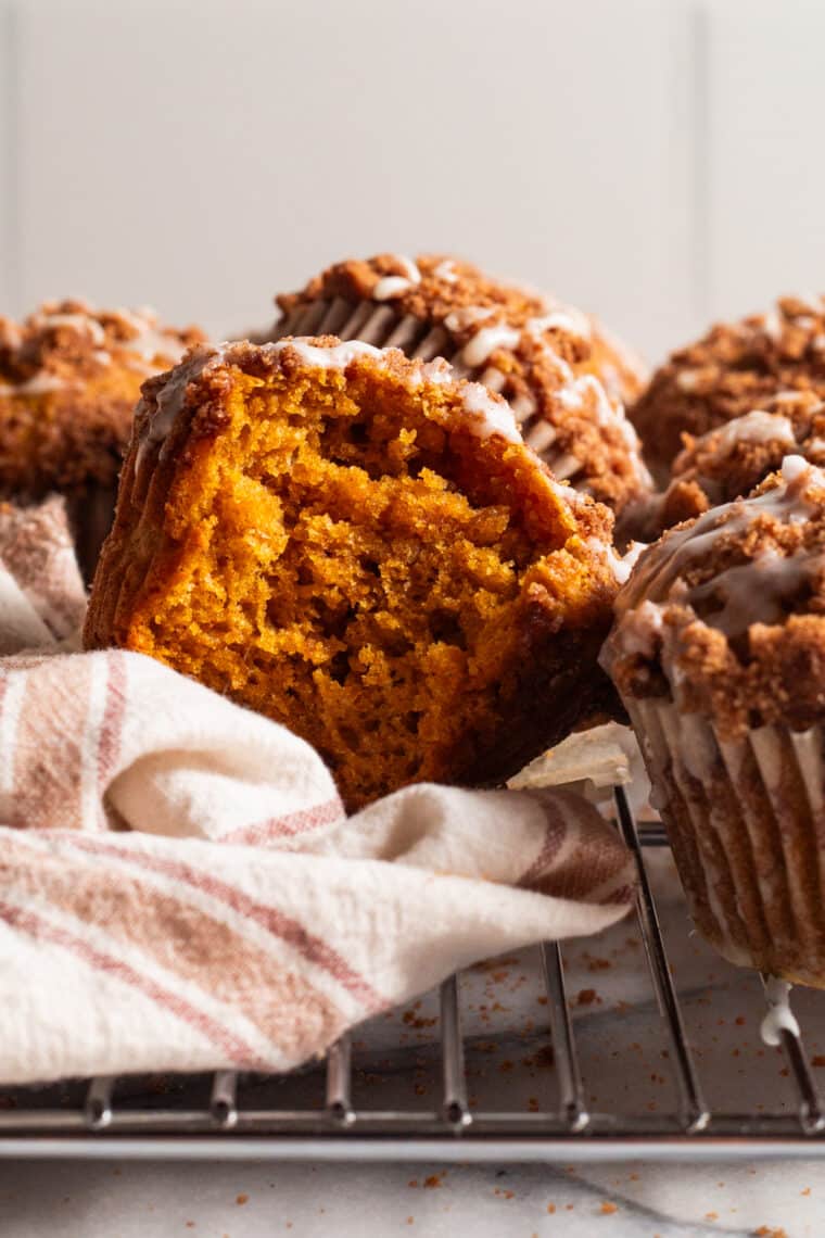 - Crumb topping. The crumbly cinnamon streusel topping combined with a drippy vanilla glaze takes these muffins over the top, making them bakery-quality.