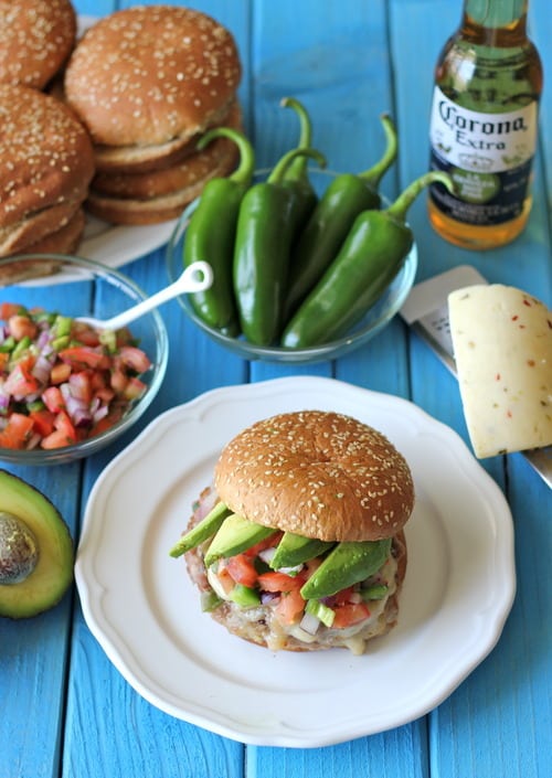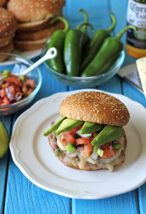 Now on to something more pleasant: burgers. No wait, burgers with jalapeño pico de gallo. And some homemade refried beans. And sliced avocado. And you can’t forget the melted jalapeño monterey jack cheese. That’s a lot of “ands” but you get my point. These burgers are packed with amazingness. And you’ll want to finish every last bite, with a cold beer of course.