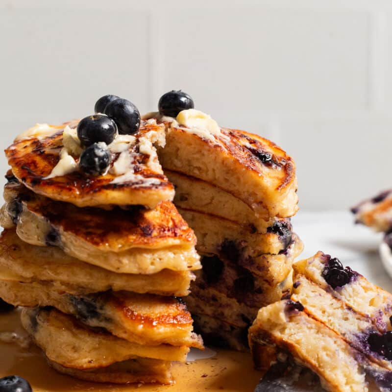 Start your mornings off right with these light, fluffy protein-packed pancakes, loaded with juicy blueberries. And they are freezer-friendly!