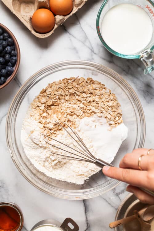 - In a large bowl, combine flour, oats, sugar, baking powder, baking soda and salt.