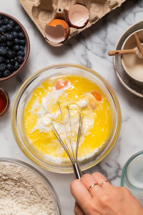 - In a large glass measuring cup or another bowl, whisk together yogurt, milk, butter and eggs.