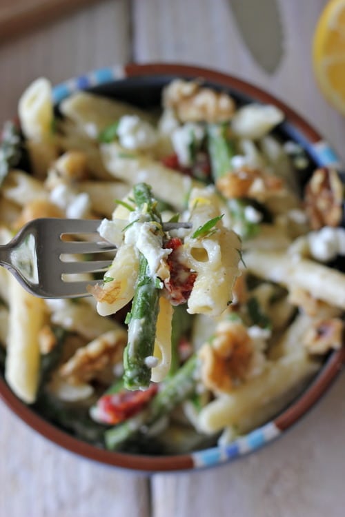 Now for those whose Monday was not filled with overstuffing yourselves with Korean food and a pink cake, I have an amazing vegetarian pasta dish for you today. It’s filled with roasted asparagus and sun dried tomatoes along with crumbled goat cheese, crunchy toasted walnuts and a creamy Meyer lemon pasta sauce that’s incredibly vibrant and refreshing in every bite. It takes just minutes to put together and works perfectly as a #MeatlessMonday dish, or any other meatless day of the week.