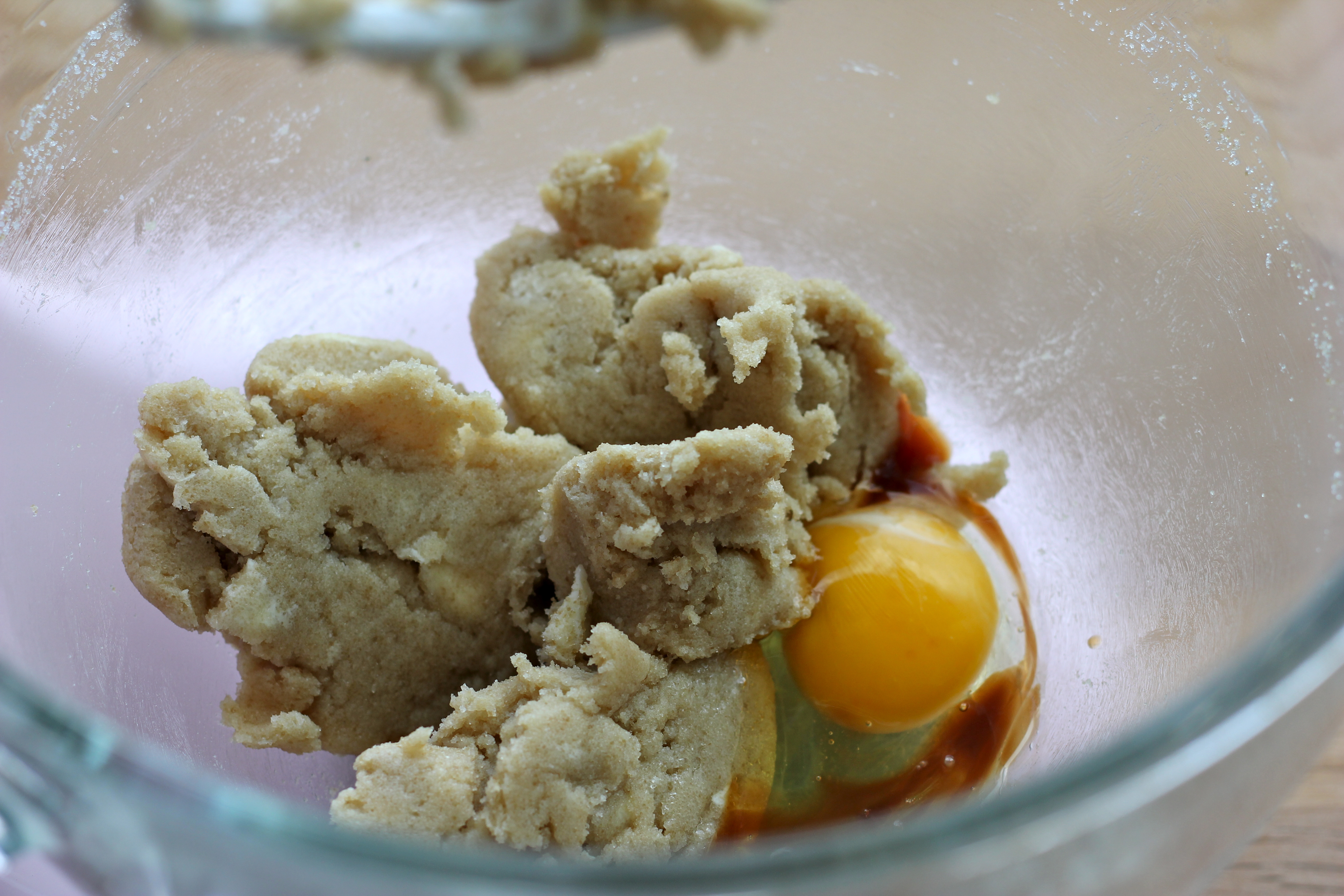 In the bowl of an electric mixer fitted with the paddle attachment, beat butter and sugars on medium-high until light and fluffy, about 2-3 minutes. Beat in vanilla and egg until well combined. Gradually add both flours, baking powder, baking soda and salt at low speed, beating just until incorporated.