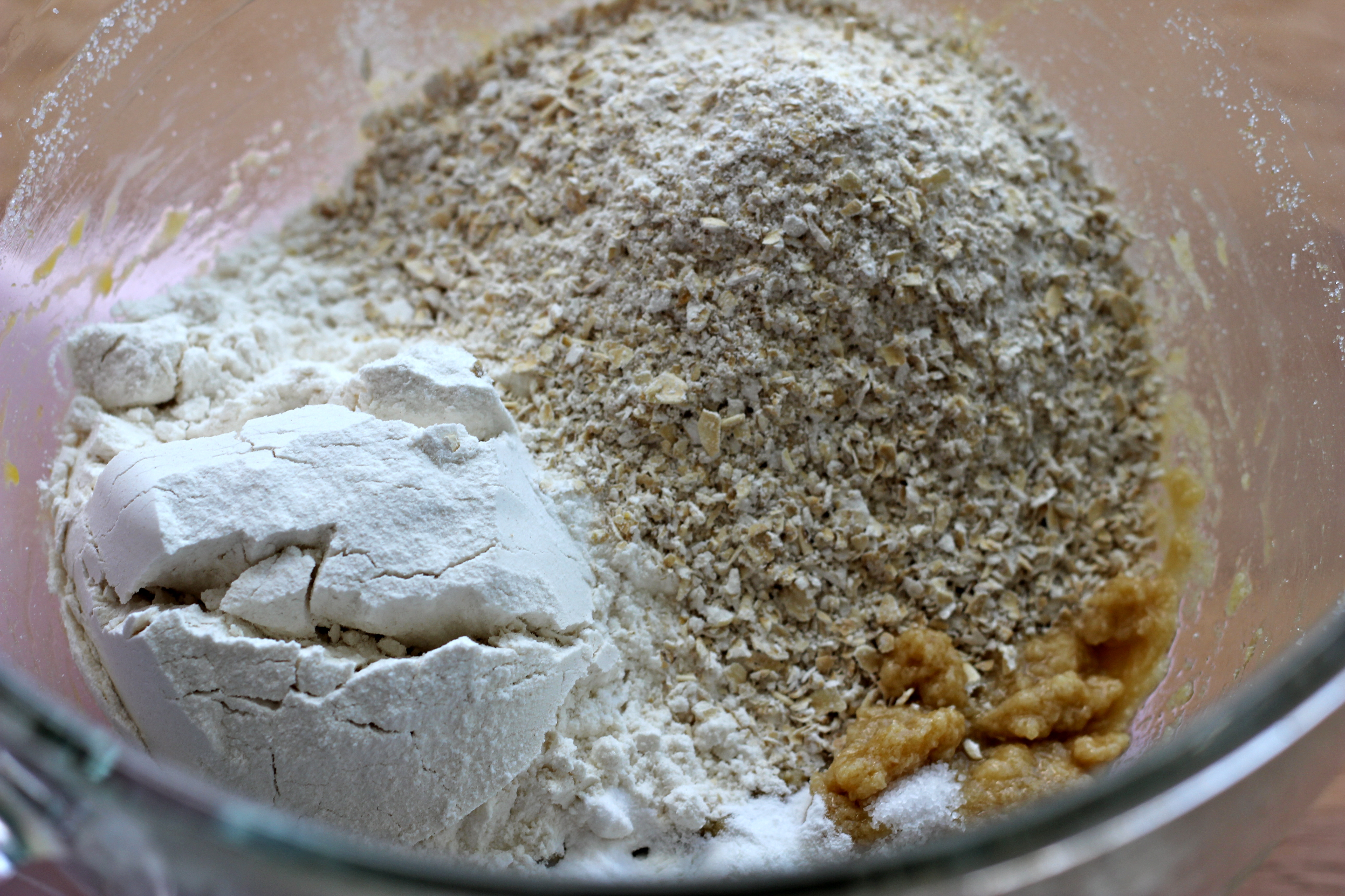 Next goes in the flour, oat flour that we made earlier, baking powder, baking soda and salt.