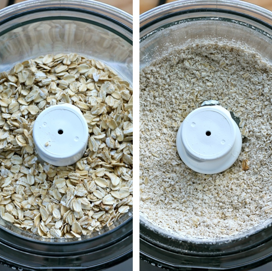 In the bowl of the food processor, such as the Magimix, pulse oats until mixture resembles coarse meal, with just a few pea-size pieces remaining; set aside.