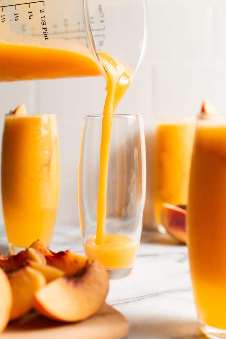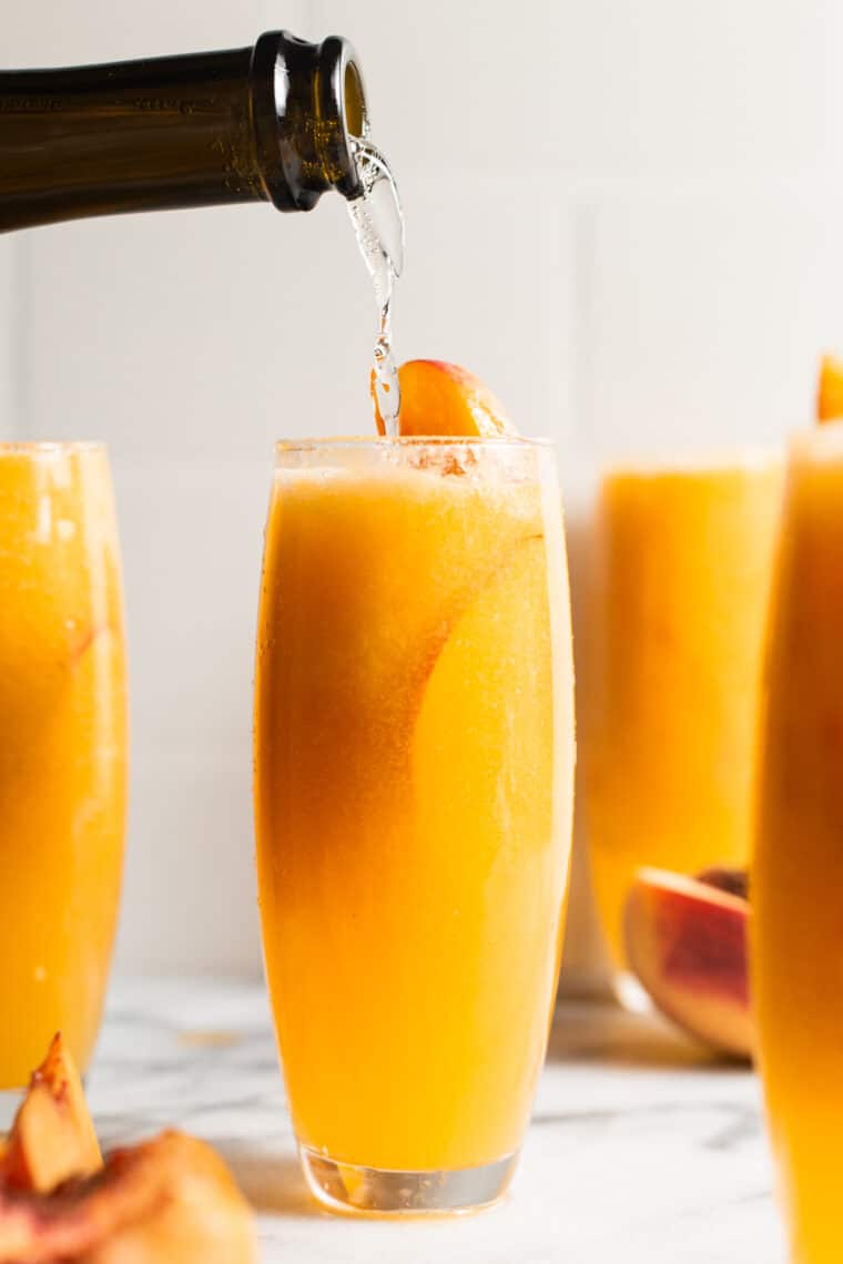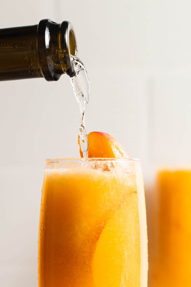 - Short ingredient list. We’re talking just 3 ingredients here – frozen peaches, mango nectar, and prosecco (or champagne).