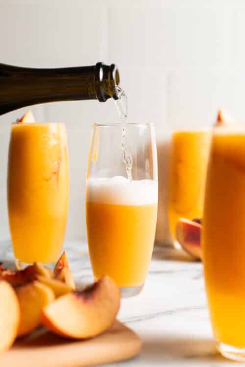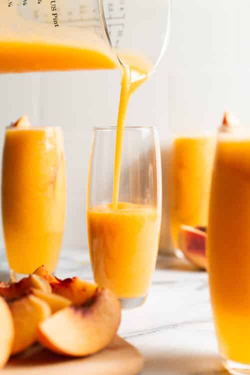 Absolutely! If you have in-season peaches, slice them into wedges first, flash freezing on a baking sheet lined with wax paper or parchment paper and freezing for 1 hour until solid. Transfer the peaches to an airtight, resealable freezer bag, freezing up to 3 months or use immediately for bellinis.